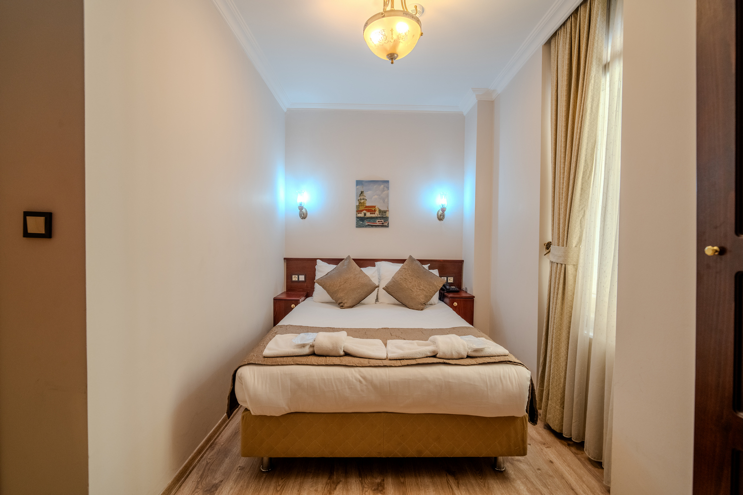 15 m² büyüklüğündeki Economy Room, 2 kişi konaklamaya uygun olup 1 adet geniş çift kişilik yatak sunar. Şehir manzaralı bu oda, Sultanahmet’te tarihi yapılar ve İstanbul’un eşsiz atmosferine yakın konumuyla öne çıkar. Konforlu tasarımı sayesinde hem kısa hem uzun süreli konaklamalar için idealdir. Terasa çıkarak Boğaz ve deniz manzarasının keyfini çıkarabilirsiniz.